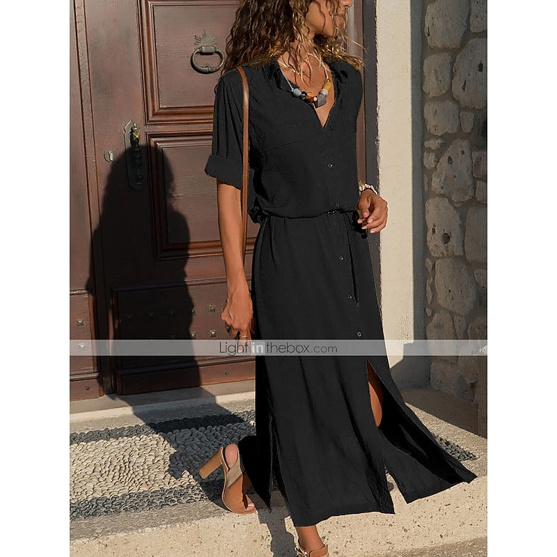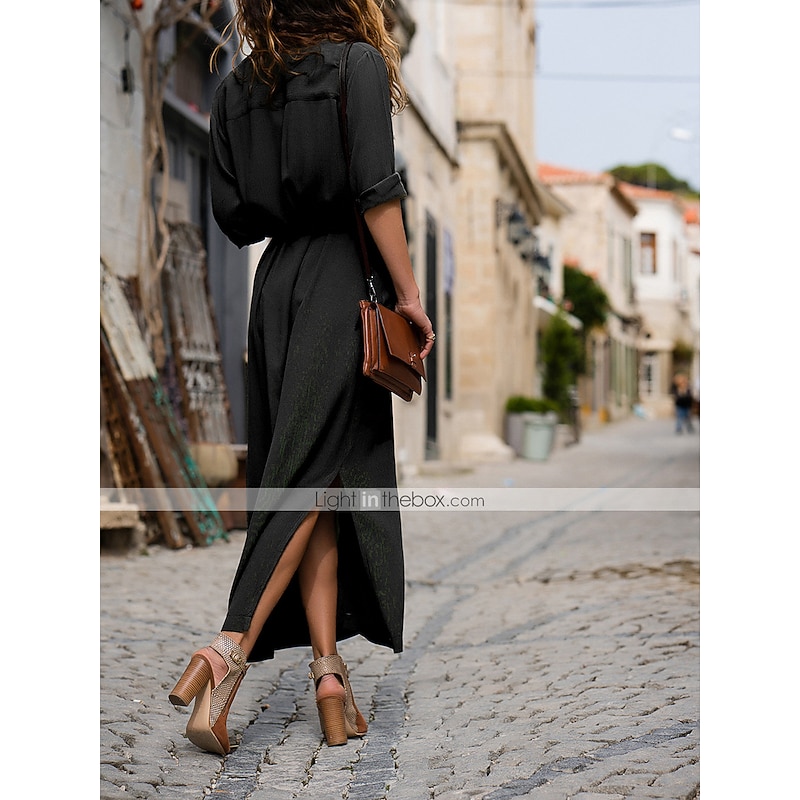 More information about Women's Shirt Dress Maxi long Dress Black Army Green Navy Blue Long Sleeve Solid Color Button Spring Summer Shirt Collar Stylish Work Formal