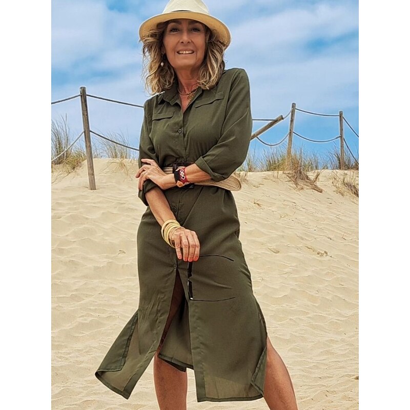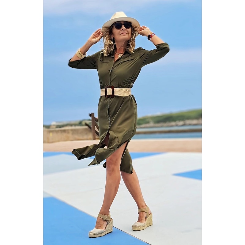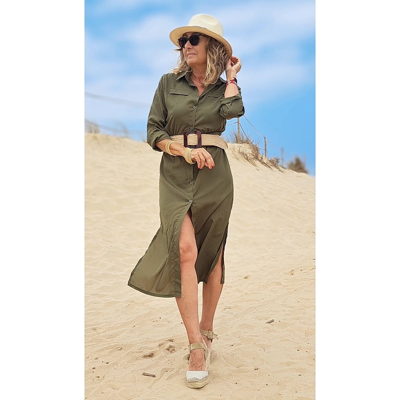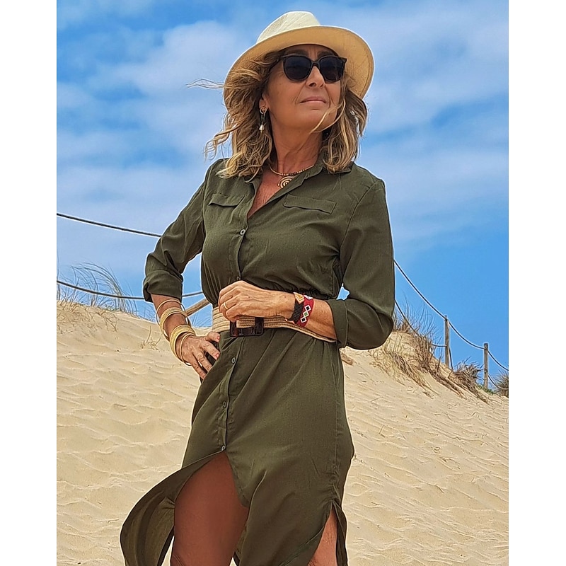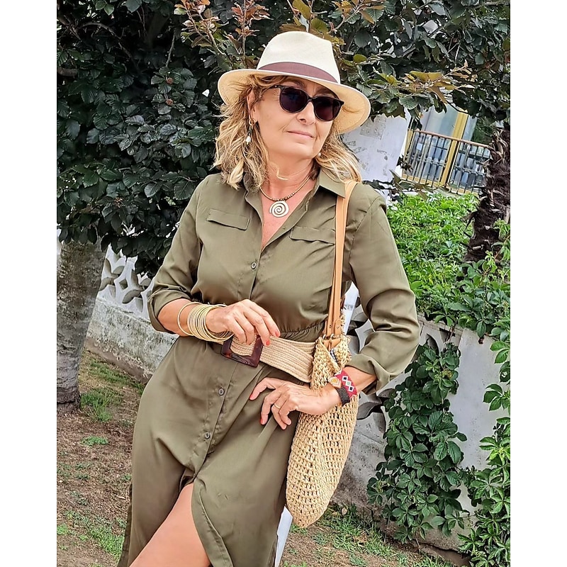 Women's Shirt Dress Maxi long Dress Black Army Green Navy Blue Long Sleeve Solid Color Button Spring Summer Shirt Collar Stylish Work Formal 15