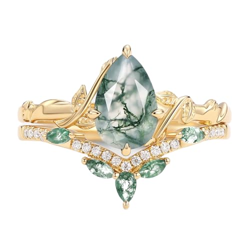 HOT ! 1.5 Carat Moss Agate Wedding Ring Set for Women - Pear Cut Moss Agate Bridal Sets Wedding Rings White Yellow Rose 10K 14K 18K Gold Vintage Leaf Anniversary Promise Ring Set for Her