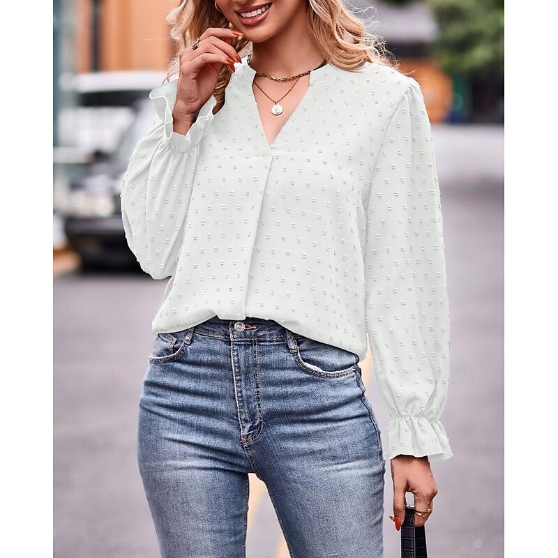 Highlights [Fabric] : Crafted from lightweight and breathable textured fabric, this women's blouse provides a comfortable fit perfect for spring and fall. The micro-elastic fabric composition ensures ease of movement while maintaining an elegant appearance. [Fit] : Featuring a regular fit, this blouse is designed to be versatile and flattering, pairing seamlessly with a variety of bottoms for both casual and more polished looks. [Design Highlights] : The blouse showcases a sophisticated notched neckline complemented by stylish ruffle sleeves with ruched detailing. The long sleeves have a gentle ruffle at the cuffs, providing a subtle yet stylish edge to the classic design. [Occasions] : Ideal for daily wear and work settings, this elegant blouse seamlessly transitions from day to evening, making it suitable for diverse occasions including office meetings and friendly gatherings. [Size Range] : Available in a wide range of sizes from S to 2XL, this blouse caters to various body types, ensuring an inclusive fit for all customers seeking a stylish, elegant piece.