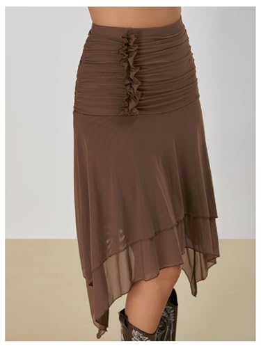 Women's Ruffle Ruched Mesh Asymmetrical Skirt Western Layered Midi Skirts 5