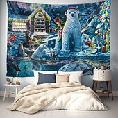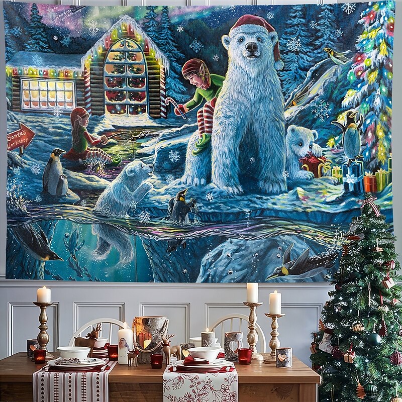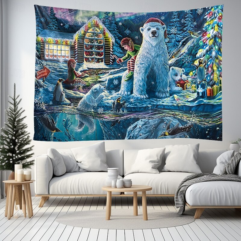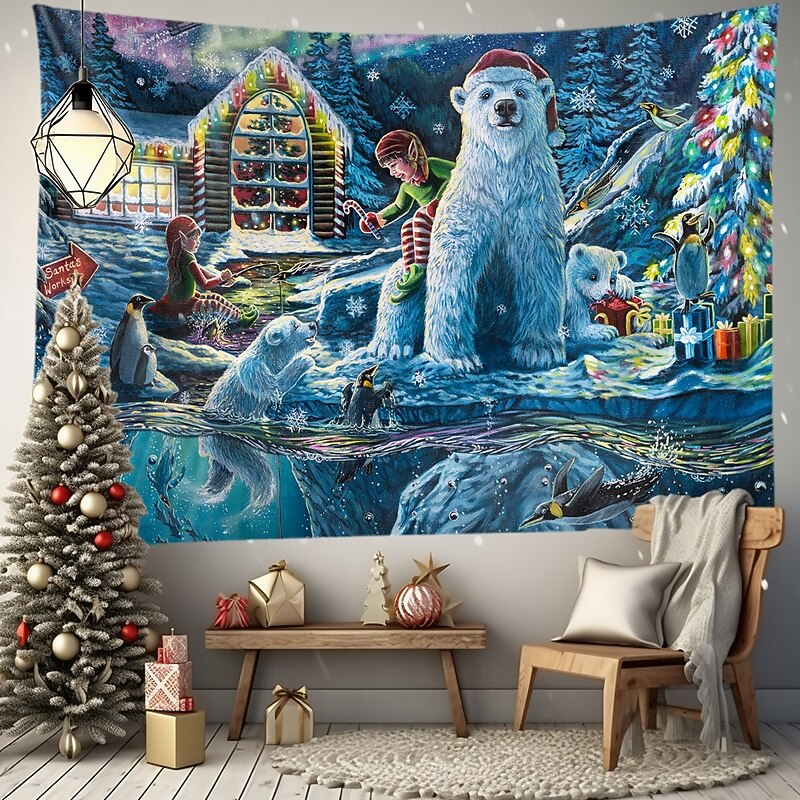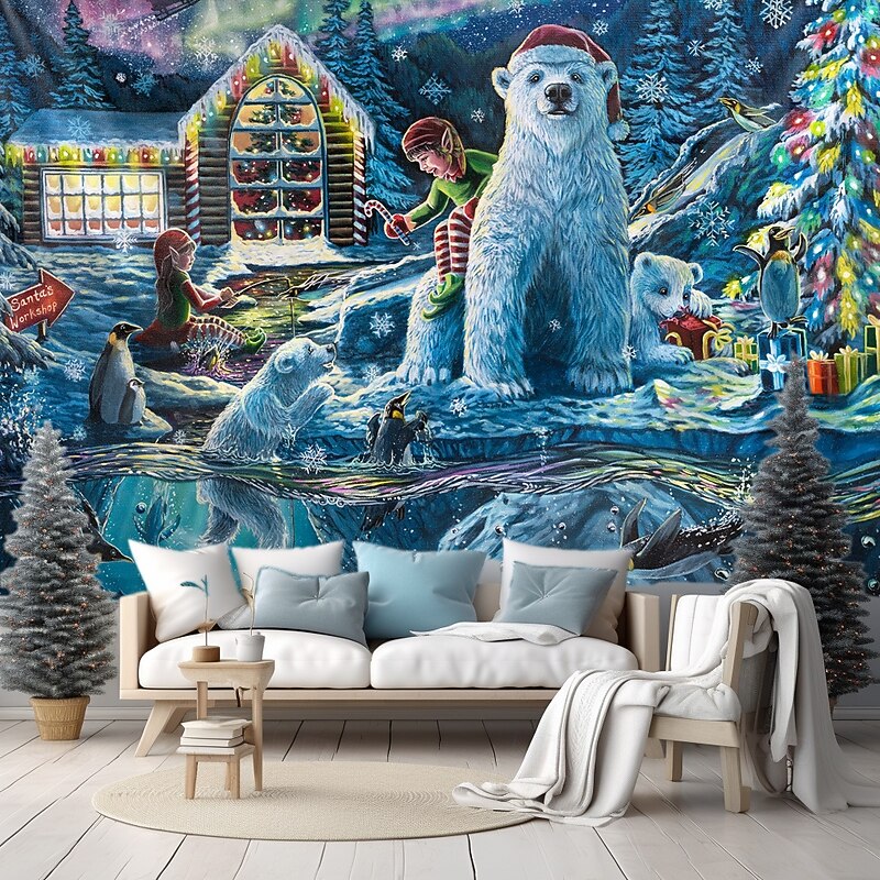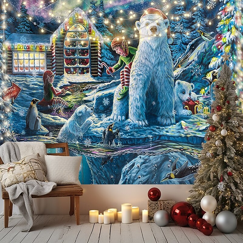 Highlights "Christmas Eve at the Workshop" - 2022 Annual Christmas Painting by Dakota Daetwiler This tapestry is absolutely magical. It is bursting with happiness and joy, with penguins and polar bears celebrating Christmas Eve in the most adorable way. The polar bear cub's eyes are full of wonder as it unwraps a present, and the penguins are having the time of their lives jumping in and out of the sparkling water and going down the ice slide. An elf sits on the cold bank casting her fishing reel with a candy cane on the end for the little fish to nibble on. The intricate snowflakes and Santa flying through the sky with the Northern Lights / aurora-borealis in the background make this painting a truly whimsical and nostalgic piece. The colors are so vibrant and lively, they practically jump off the canvas. Every time I look at this painting, I can't help but feel a joyful child-like feeling wash over me. It's the perfect reminder of the magic and joy of Christmas eve at the North Pole, after all the work is done and it's time to relax and celebrate with loved ones. I hope you enjoy "Christmas Eve at the Workshop."
