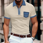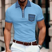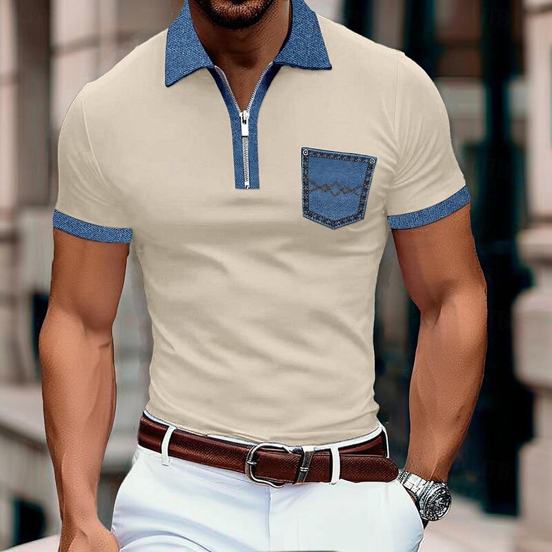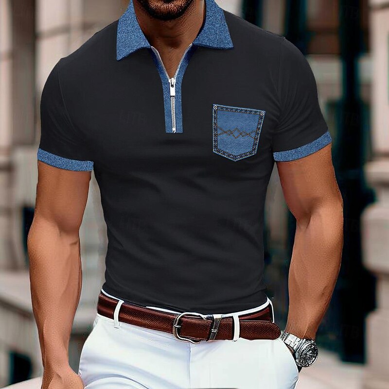 Highlights [Fabric] Crafted from high-quality polyester, this men's polo shirt is perfect for summer. Its breathable and soft fabric ensures comfort throughout any casual or semi-formal event, while its micro-elastic property allows for flexibility and ease of movement. [Fit] The shirt features a regular fit that provides a flattering silhouette for all body types. Its versatile design makes it suitable for a variety of occasions. [Design Highlights] This polo shirt boasts a contemporary quarter zip neckline paired with a classic lapel, offering adjustable style and comfort. The color block pattern in light blue, black, white, khaki, and dark grey brings a modern twist to this timeless piece, while denim accents at the collar and sleeve cuffs add a touch of chic sophistication. [Occasions] Ideal for holidays, casual outings, and golf sessions, this polo shirt effortlessly combines style and function. Its stylish appearance makes it a go-to choice for various events, providing a balance of casual charm and elegance. [Size Availability] Available in a comprehensive range of sizes from S to 3XL, this polo shirt caters to a wide audience, ensuring a perfect fit for everyone.