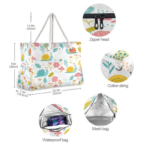Cute Snail Beach Tote Bag for Women Large Pool Bags Carry On Bag With Wet Compartment for Beach Travel with Pocket Zipper Outdoor Tote Bag 6