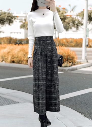 chouyatou Women's Winter High Waist Wide Leg Plaid Wool Blend Palazzo Capri Pants Culottes with Pockets 1