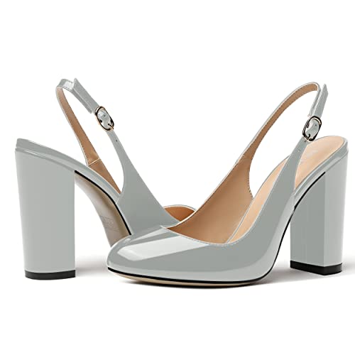 MODENCOCO Women's Patent Fashion Round Toe Buckle Slingback Sexy Wedding Block High Heel Pumps Shoes 4 Inch 5