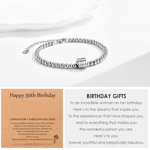 • 50TH BIRTHDAY GIFTS FOR WOMEN: Our silver bracelet for women features 5 circle rings, symbolizing 5 amazing decades. Thirty is a beautiful milestone, and this 50th birthday bracelet celebrates it perfectly. Each ring represents a decade filled with memories, growth, and achievements, making it a perfect gift to celebrate this special time.