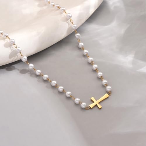 Pearl Cross Necklaces for Women 18K Gold Plated Pearl Beaded Sideways Cross Choker Necklaces Cubic Zirconia Diamond Faith Religious Jewelry Gifts 5