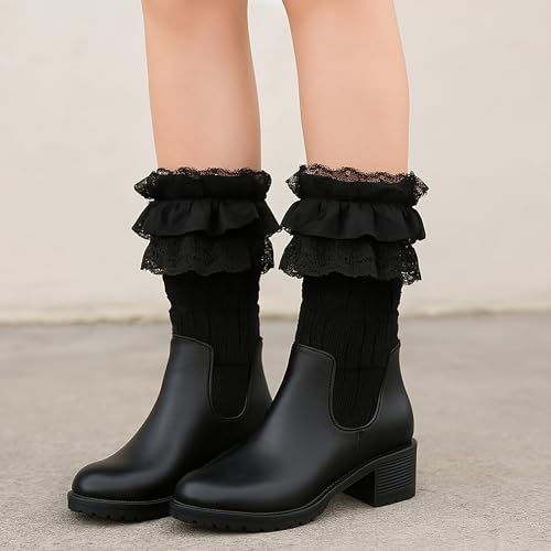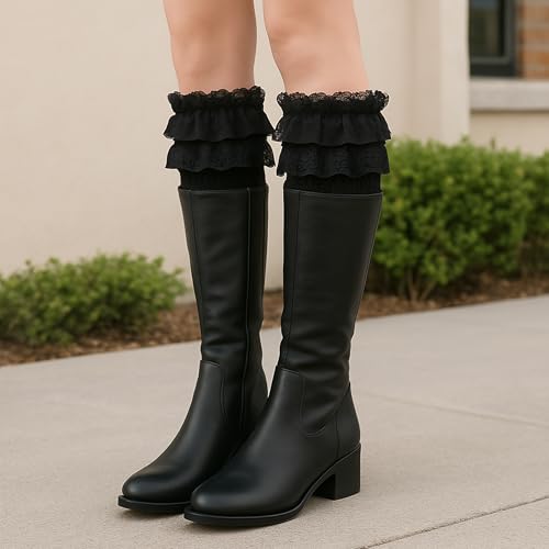 sought-after ! 1 Pair of Womens Knit Boot Cuff Socks – Crochet Lace Trim Leg Warmers Toppers, Short Stretch Knitted Cuffs for Women, Solid Color Winter cozy Cuff Topper Gift (Black)