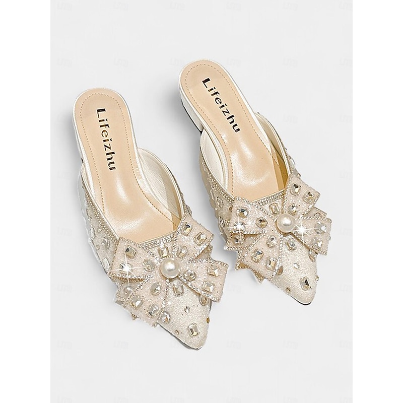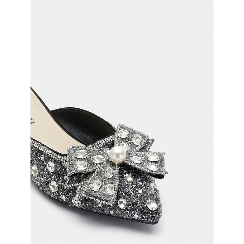 Highlights [Fabric] :Crafted from microbial leather, these mules boast a glittery finish that exudes elegance and sophistication, perfect for adding a touch of glamour to any outfit. [Silhouette] :Featuring a classic pointed-toe design, these slingbacks combine style and comfort, making them a timeless addition to your wardrobe. [Design Highlights] :The standout feature of these shoes is the oversized ornate bows adorned with sparkling rhinestones and a central faux pearl, enhancing their luxurious appeal. The crystal embellishment adds a dazzling touch, ensuring you capture attention wherever you go. [Occasions] :Ideal for parties, formal events, and other special occasions, these mules are designed to make a statement. Whether it's an elegant gathering or a night out, they will elevate your ensemble with their eye-catching design. [Size Notice] :Available in a range of sizes from US5.5 to US10.5, these mules are true to size, ensuring a comfortable fit for your next event.