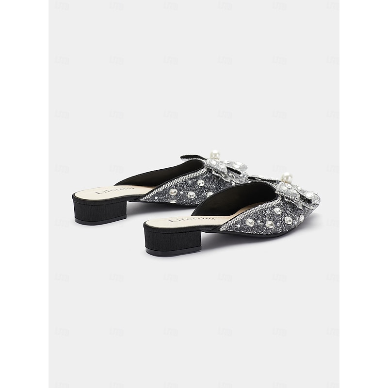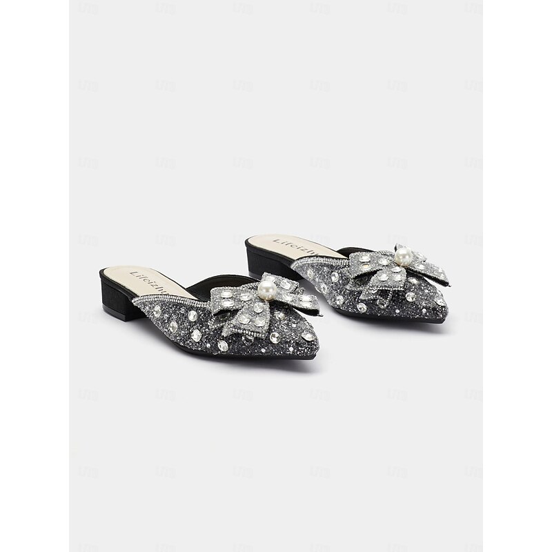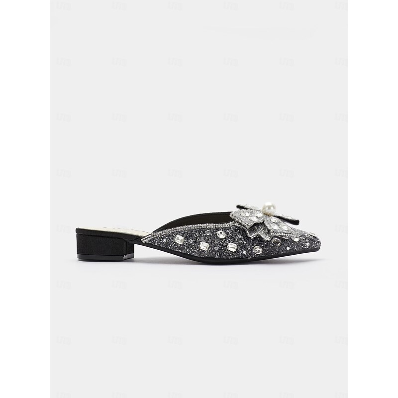 HOT ! Women's Black Glitter Mules with Rhinestone and Pearl Bow Detail for Parties and Formal Events