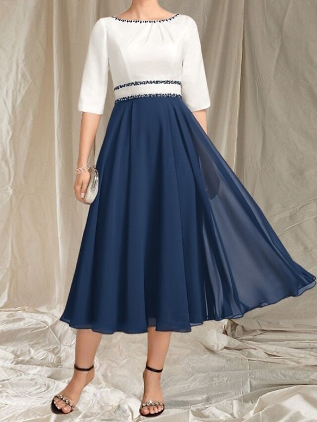 A-Line Mother of the Bride Dress Wedding Guest Elegant Crew Neck Tea Length Chiffon Satin Half Sleeve with Beading Ruching Midi Dress 18
