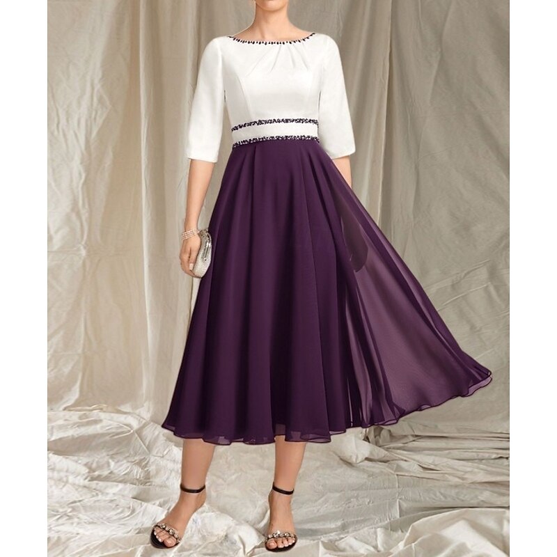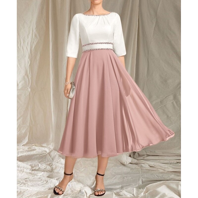 HOT ! A-Line Mother of the Bride Dress Wedding Guest Elegant Crew Neck Tea Length Chiffon Satin Half Sleeve with Beading Ruching Midi Dress