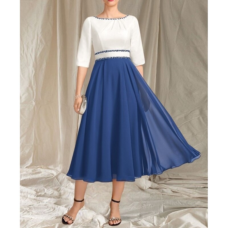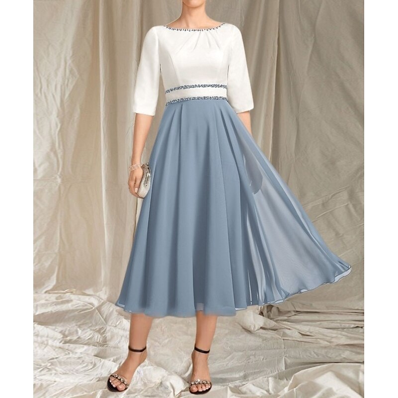A-Line Mother of the Bride Dress Wedding Guest Elegant Crew Neck Tea Length Chiffon Satin Half Sleeve with Beading Ruching Midi Dress 11