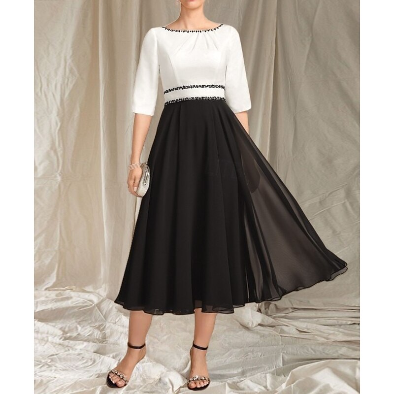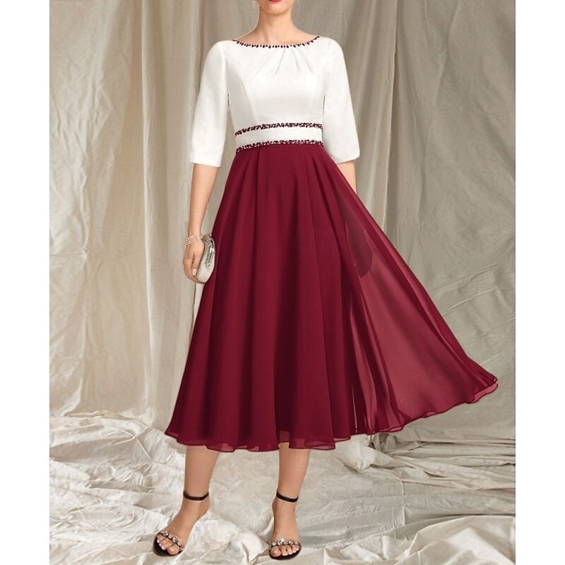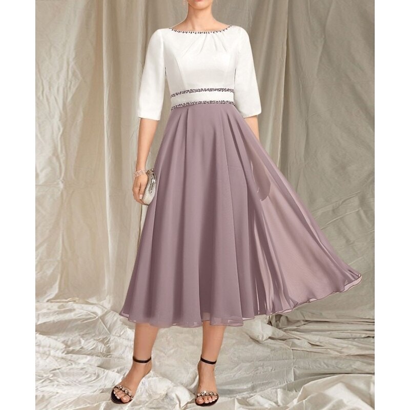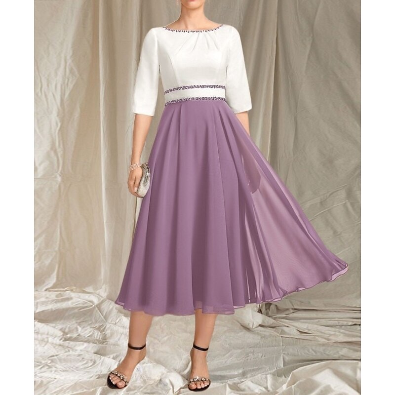 More information about A-Line Mother of the Bride Dress Wedding Guest Elegant Crew Neck Tea Length Chiffon Satin Half Sleeve with Beading Ruching Midi Dress