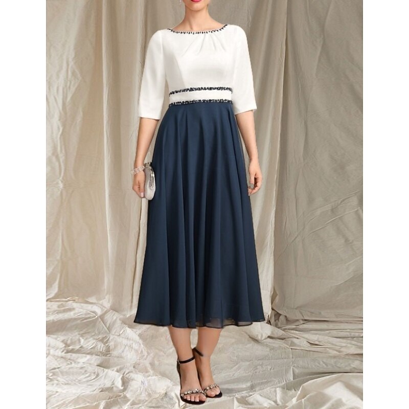 A-Line Mother of the Bride Dress Wedding Guest Elegant Crew Neck Tea Length Chiffon Satin Half Sleeve with Beading Ruching Midi Dress 1