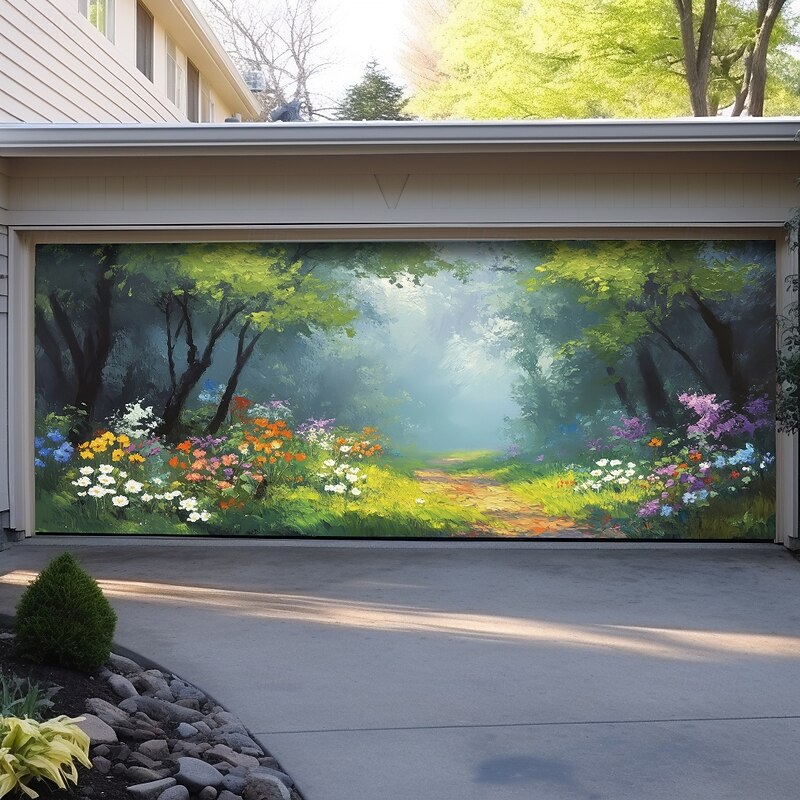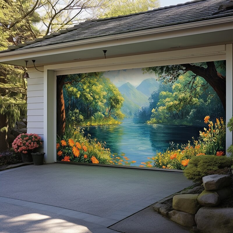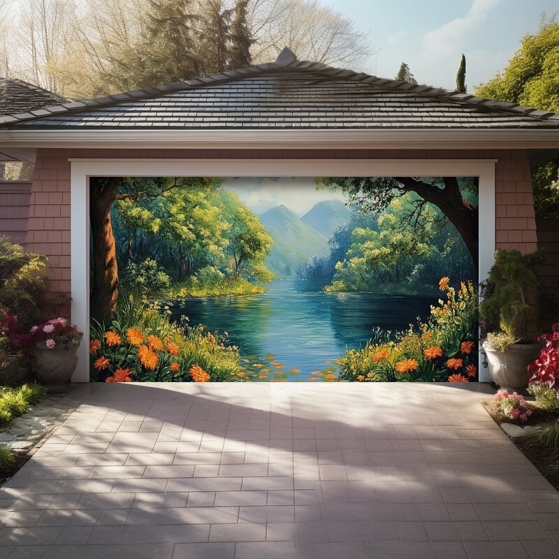HOT ! Landscape Door Decorations Garage Door Cover Spring Lake Outdoor Banner Large Backdrop for Holiday Outdoor Garage Door Home Wall Decorations