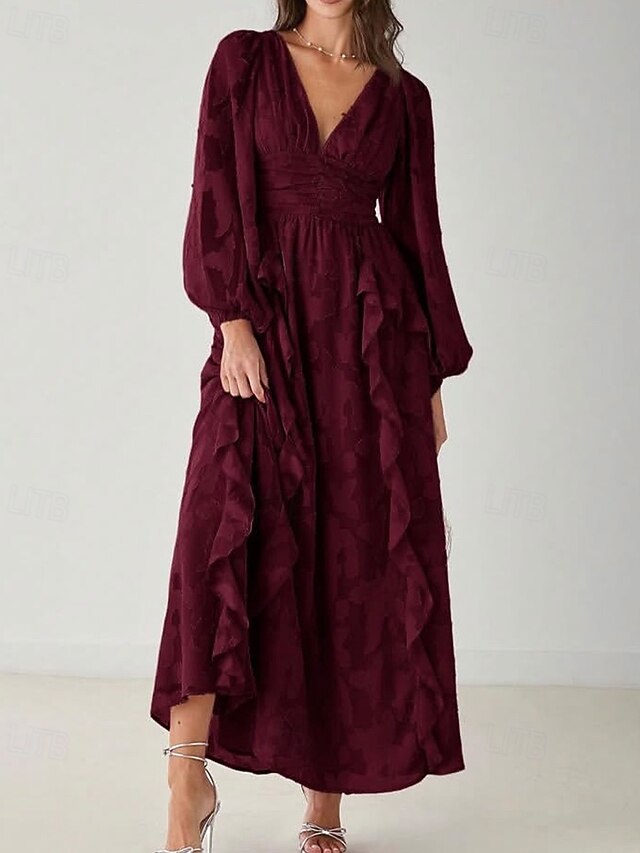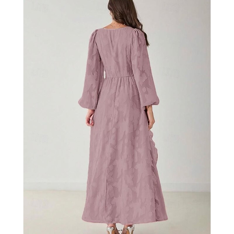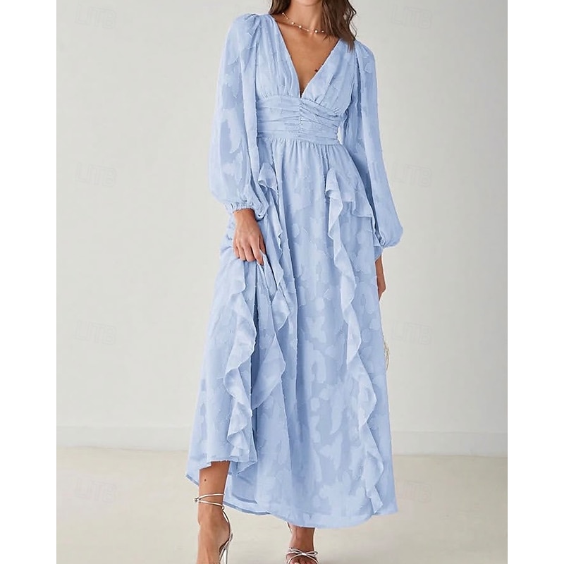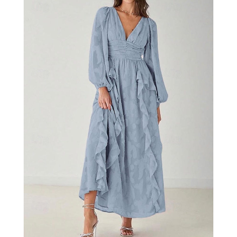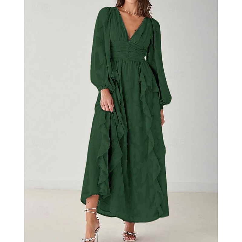 More information about A-Line Mother of the Bride Dress Elegant Simple Minimalist V Neck Wedding Guest Dress Floor Length Floral Chiffon Lace Long Sleeve with Ruched Cascading Ruffles