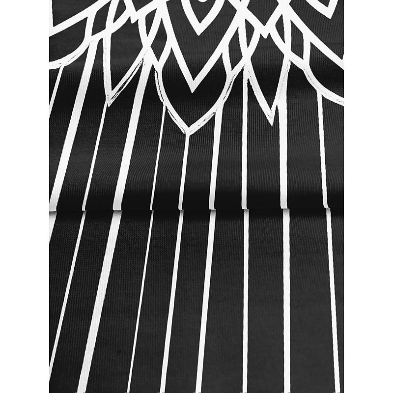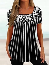 Highlights [Fabric] : Crafted from a soft blend of polyester, this women's top presents a luxurious feel and micro-elastic comfort. The fabric's lightweight nature ensures ease of movement, making it a perfect choice for daily wear. [Fit and Style] : Featuring a regular fit, this basic tunic is designed for comfort while maintaining elegance. The short sleeves and timeless square neckline add a touch of modernity, creating a flattering silhouette that is both casual and chic. [Design Highlights] : The top showcases a striking floral and striped print, adding visual interest and depth. The unique geometric pattern in a classic black and white color palette makes it an eye-catching addition to any wardrobe. [Occasions] : This versatile tee is ideal for a variety of settings, from casual outings to holiday activities. Whether paired with jeans or skirts, it effortlessly transitions from day to evening, offering a fashionable and comfortable option for each scenario. [Size Range] : Available in a range of sizes including L, XL, and 2XL, this plus size top is designed to provide a comfortable and flattering fit for various body types, ensuring confidence and style for every occasion.