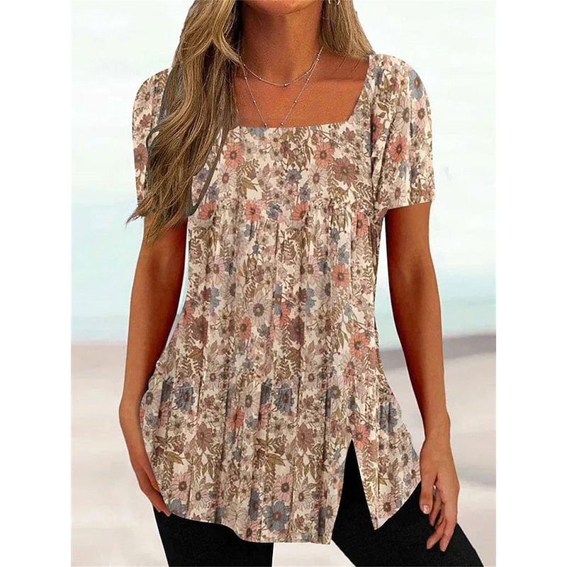 Women's Plus Size T Shirt Tunic Basic Floral Striped Print Short Sleeve Regular Tops Square Neck Casual Holiday Black White Pink Purple Dark Gray 13