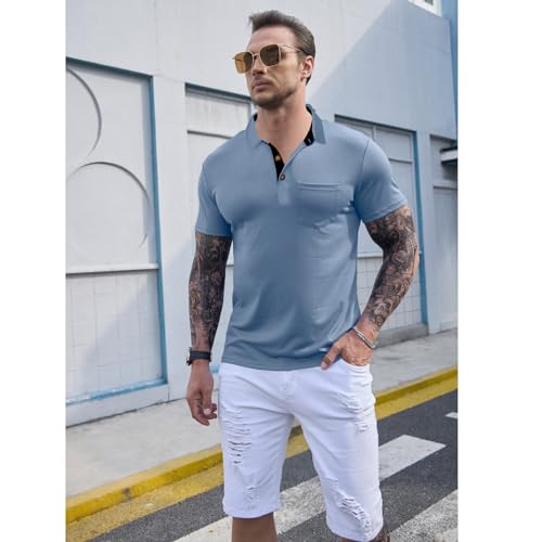 • Design: The mens fashion polo shirts is designed with classic solid color,button closure and classic lapel collar, practical chest pocket,casual fit.It features moisture wicking and air permeable,classic cut short sleeve soft cotton fabric make this polo a go to for the office or the weekend.