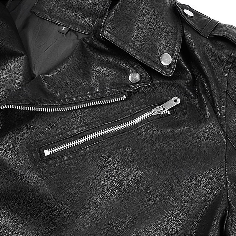 Highlights - Stay stylish and cozy this Fall and Winter with our faux leather jacket. - Long sleeves provide warmth and comfort during colder seasons. - The stand collar adds a chic touch to your outfit. - Update your wardrobe with this versatile piece that transitions seamlessly from day to night.