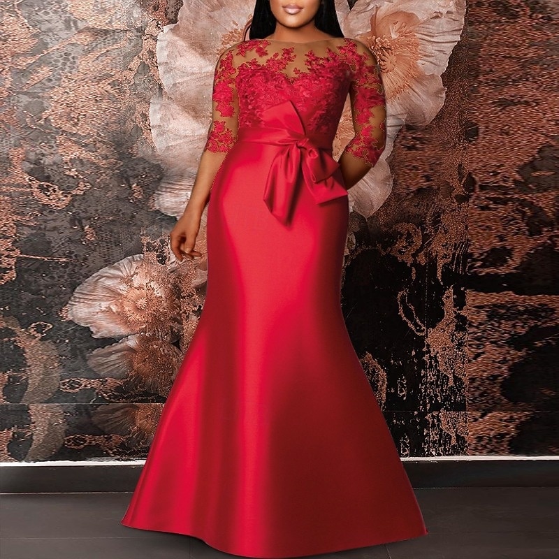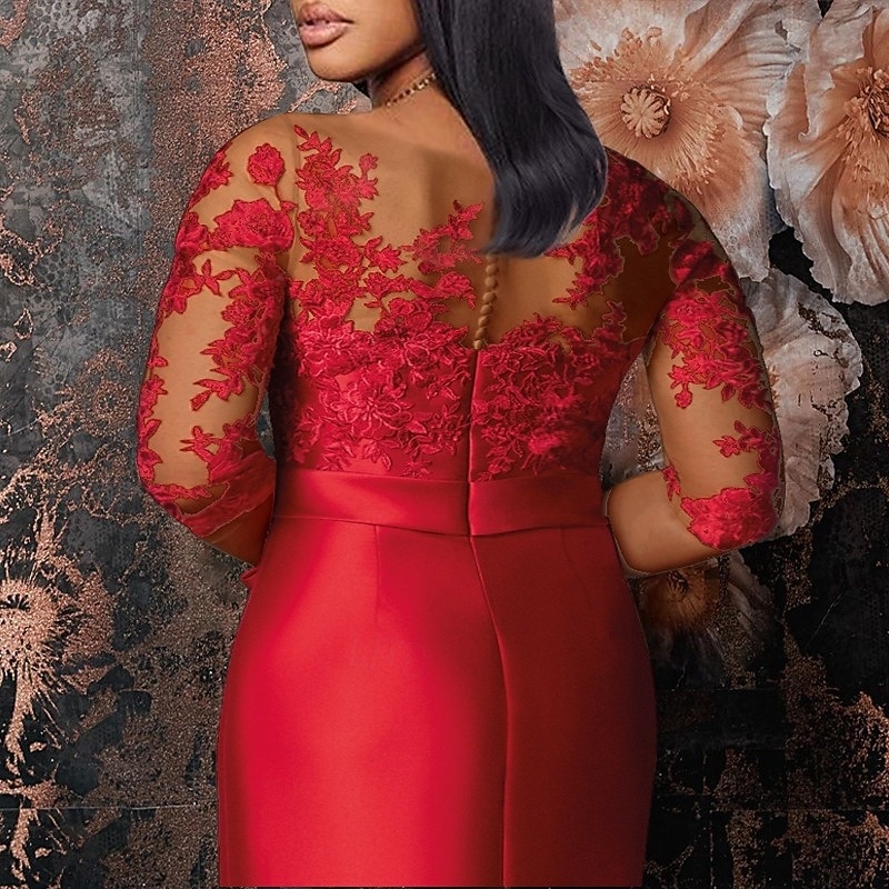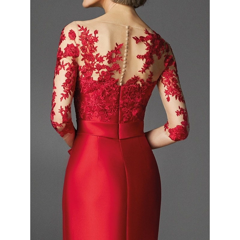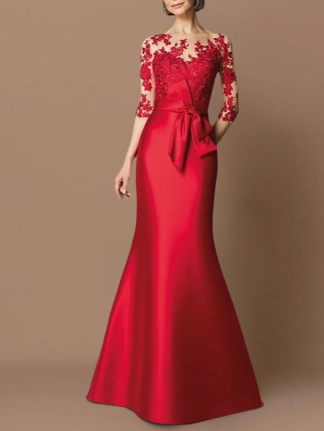 More information about Mermaid Mother of the Bride Evening Gown Elegant Dress Engagement Floor Length 3/4 Length Sleeve Illusion Neck Fall Wedding Guest Satin with Appliques