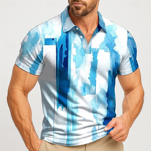 Men's Geometic Polo Short Sleeve Polo Shirts Lapel Casual Athleisure Daily Wear 3D Print Buttons Summer Lake blue Blue Gray 3