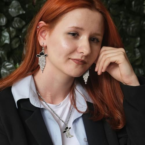2pcs Western Earrings Necklace Jewelry Set,Sparkly Rhinestone Tassels Cowgirl Earrings+Crystal Boots with Enamel Cowboy Hat Pendant Necklac for Women,Wild West Country Rustic Style 6