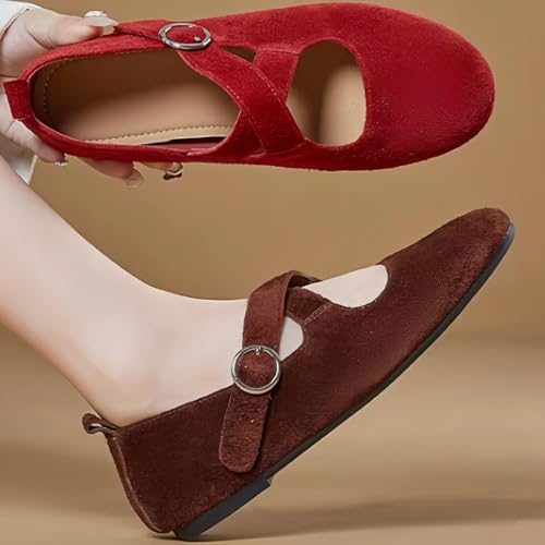Sole material: Thermoplastic ElastomersOuter material: Suede leatherClosure type: BuckleWater resistance level: Not Water ResistantSUPERIOR MATERIALS: Cowhide suede leather (a type of genuine leather) upper, soft sheepskin lining and insole, anti-slip and lightweight thermoplastic polyurethane outsolesEASY TO WEAR: These flats with metal buckle are easy to put on/offCOZY HEIGHT: Equipped with 0.6-inch sole, making them perfect for all-day wear without sacrificing comfortFASHION LOOK: Embrace a blend of retro charm and modern elegance! Featuring classic Mary Jane style with crisscross straps and a metal buckle, these flats exude timeless allure. The rounded toe lends a gentle touch, while the cowhide suede leather upper brings a soft, textured appearance. Pair them with a flowy chiffon dress for a romantic vibe, cropped trousers for a neat casual feel, or a linen jumpsuit for an elegant, laid-back lookVERSATILE FOR ANY OCCASIONS: For the office, match them with tailored trousers and a button-down shirt for a polished professional look, or combine with a pencil skirt and a blazer for sleek elegance. For casual outings, team them with high-waisted jeans and a cozy sweater, or a denim skirt and a plain tee for a relaxed, sophisticated vibe. For semi-formal events, pair them with a midi dress to add a touch of sophistication while staying comfortable Perfect for everyday use. first-class materials and excellent craftsmanship ensure long-lasting durability.