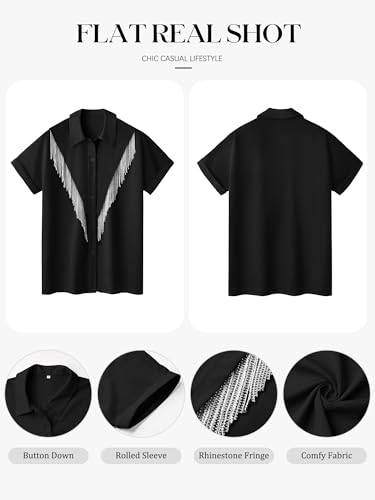 MYMORE Women's Western Cowgirl Sparkly Fringe Button Down Shirt Rolled Cuffed Short Sleeve Shirt Country Concert Outfit 1