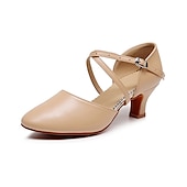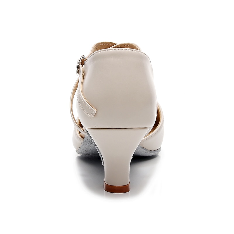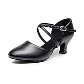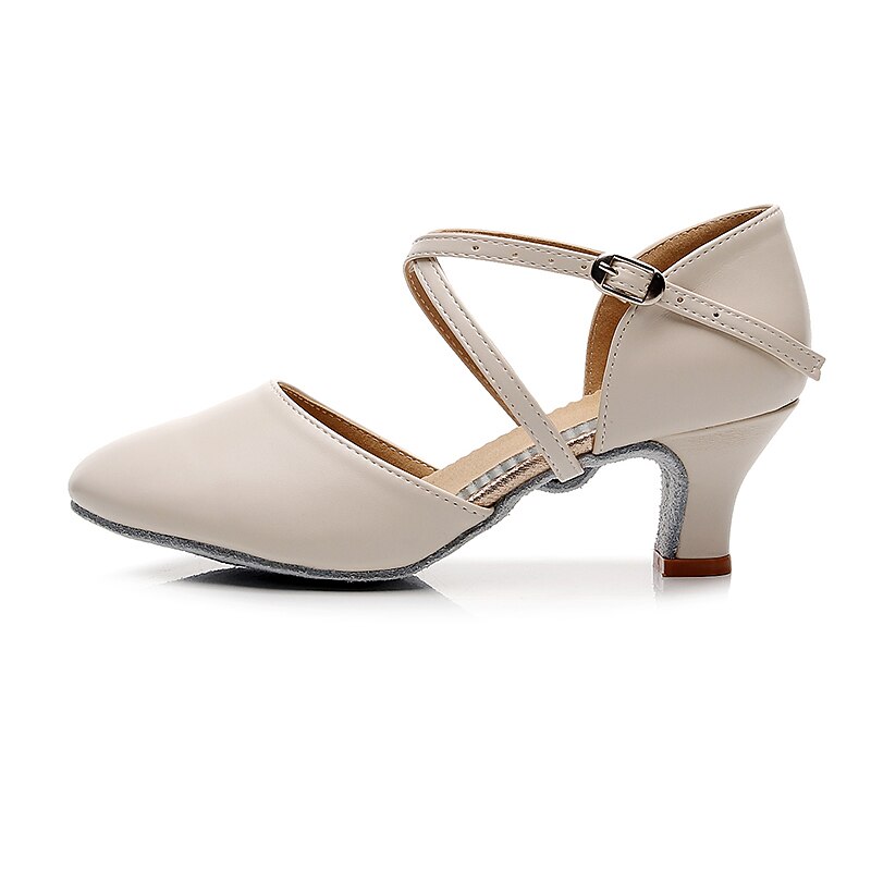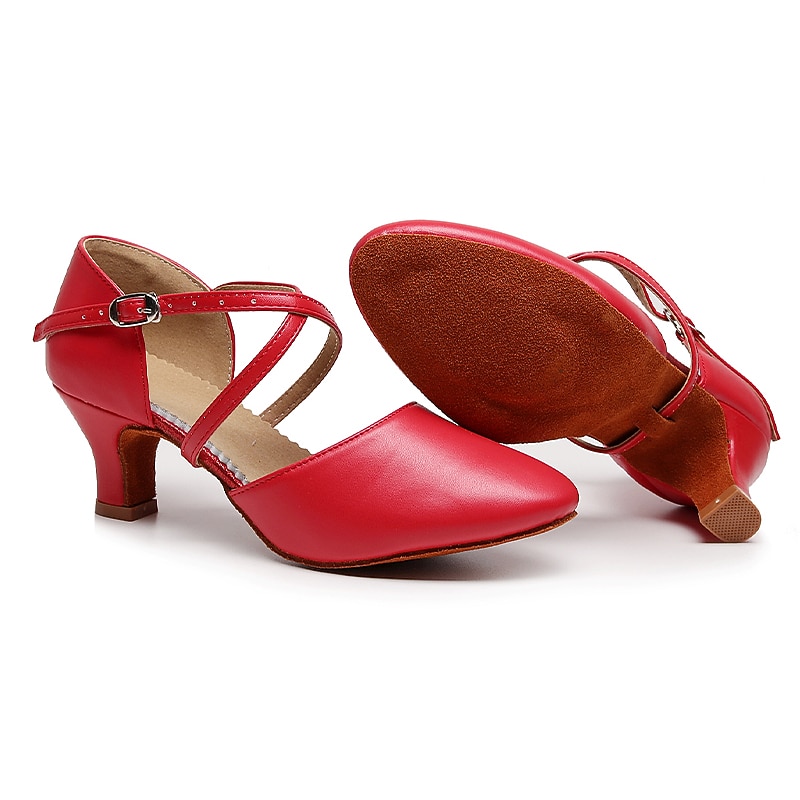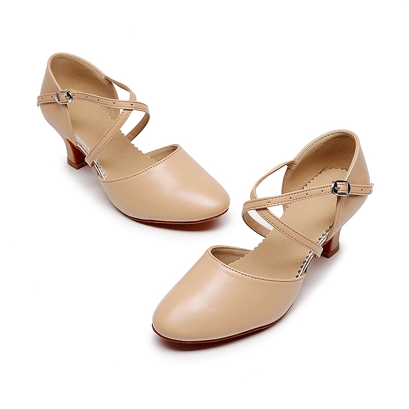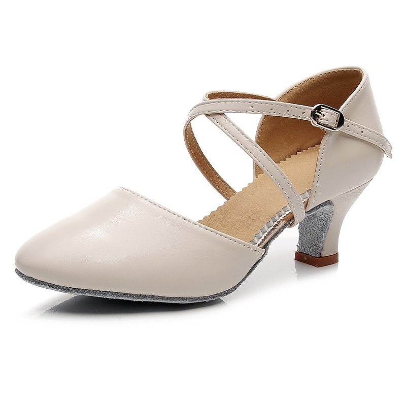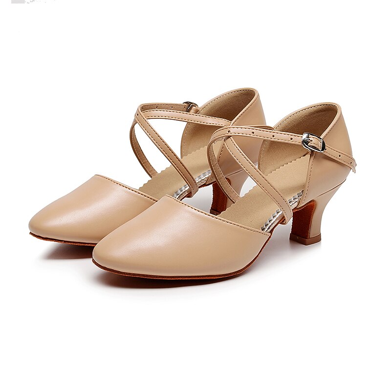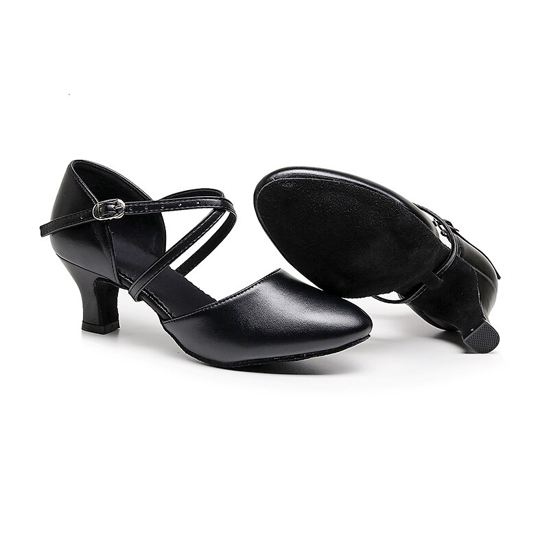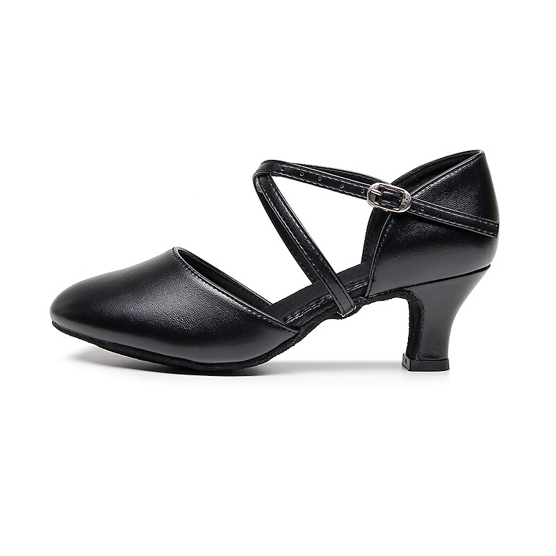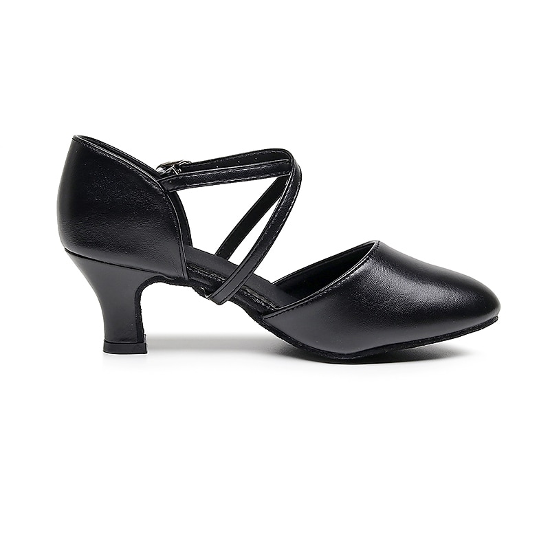 Highlights [Fabric] : Crafted from high-quality leatherette, these modern dance shoes offer a blend of durability and sleek aesthetics. The leatherette material provides a classic, sophisticated look, while ensuring long-lasting wear and ease of maintenance. [Fit] : Designed with a rounded toe and a high heel, these shoes offer both comfort and elegance. The mid-height heel provides just the right amount of lift, ensuring stability and comfort during extended periods of wear. [Design Highlights] : Featuring a double cross-strap with an adjustable buckle, these shoes offer a secure and customizable fit. This design not only enhances the shoe's style but also provides the necessary support for dynamic dance movements. The solid color adds a timeless, versatile appeal suitable for various outfits. [Occasions] : Perfect for proms, evening parties, and dance practice, these shoes are a versatile addition to any wardrobe. Their elegant design complements both casual and formal settings, making them ideal for dancers and party-goers alike. [Size Range] : Available in a range of sizes including US6 to US9, these shoes cater to a variety of foot shapes and sizes. For those with wider feet, it is recommended to consider choosing a size up to ensure the best fit.
