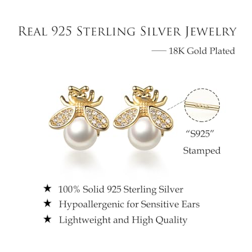 Reffeer Solid 925 Sterling Silver Bumble Bee Stud Earrings for Women Teen Girls Honey Bee Stud Earrings Pearls 4