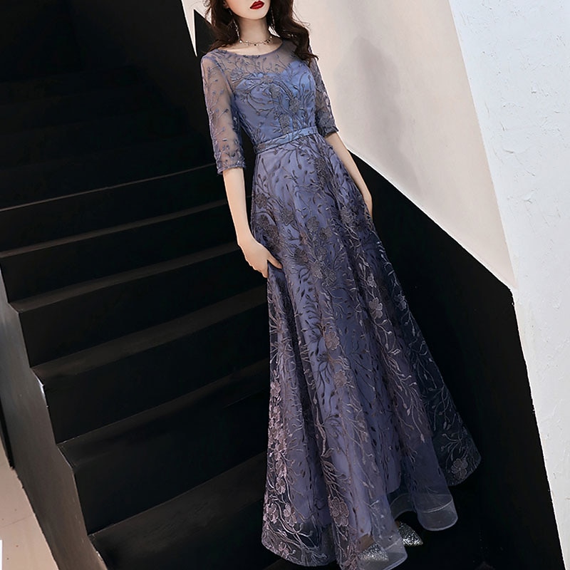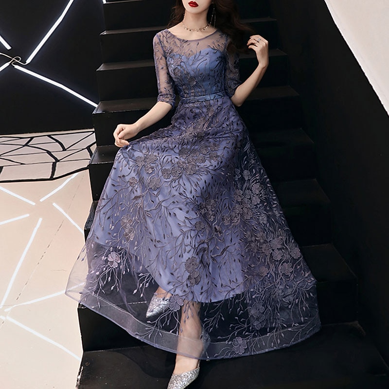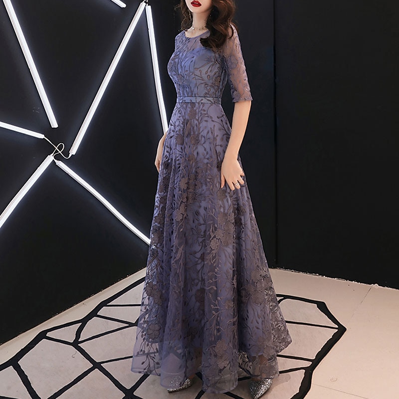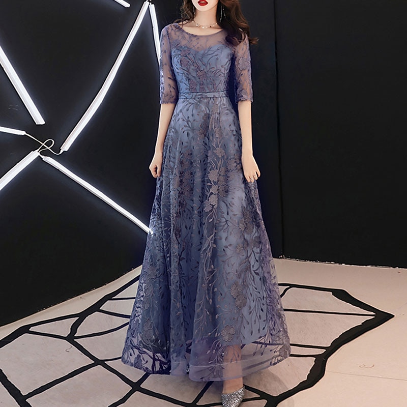 More information about A-Line Evening Gown Elegant Dress Wedding Guest Formal Evening Floor Length Half Sleeve Jewel Neck Tulle with Embroidery Pattern / Print free custom size