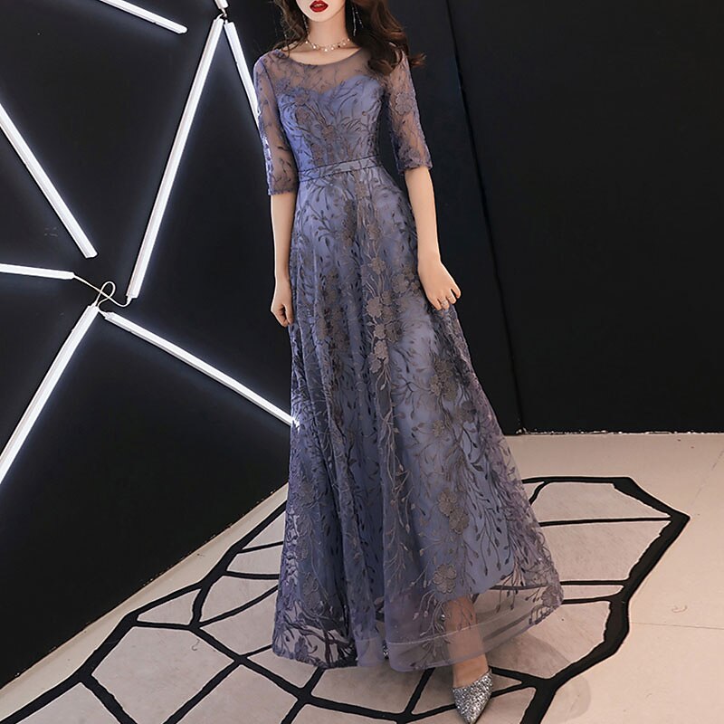 A-Line Evening Gown Elegant Dress Wedding Guest Formal Evening Floor Length Half Sleeve Jewel Neck Tulle with Embroidery Pattern / Print free custom size 4