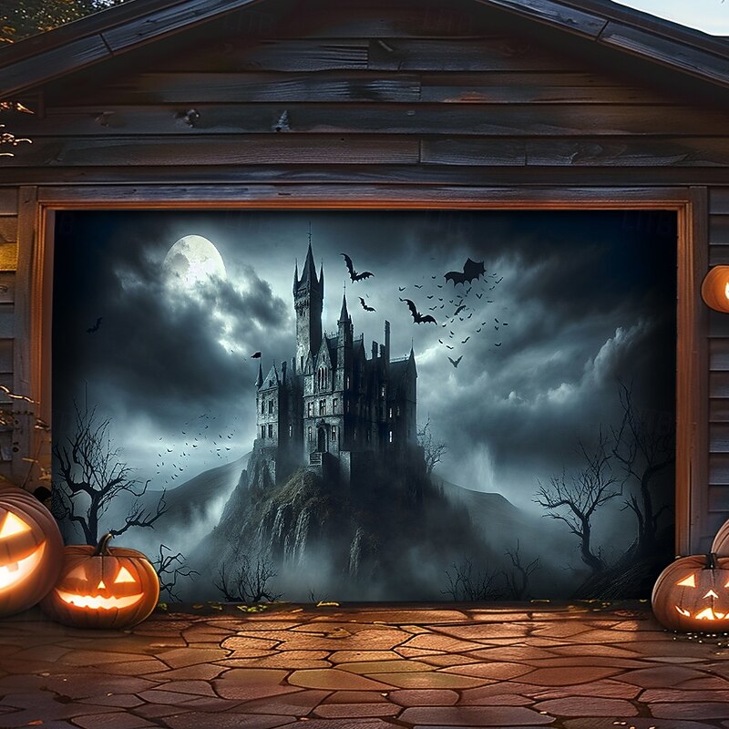 Halloween Tapestry Garage Door Cover Large Hanging Backdrop Pumpkin Castle Dark Punk Gothic Style Party Outdoor Shooting Backgrounds Front Door Home Decor 8