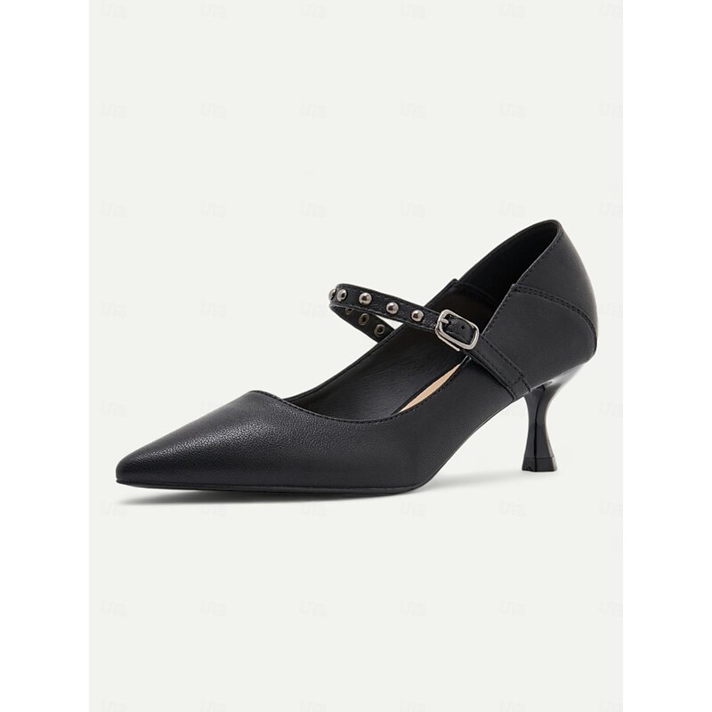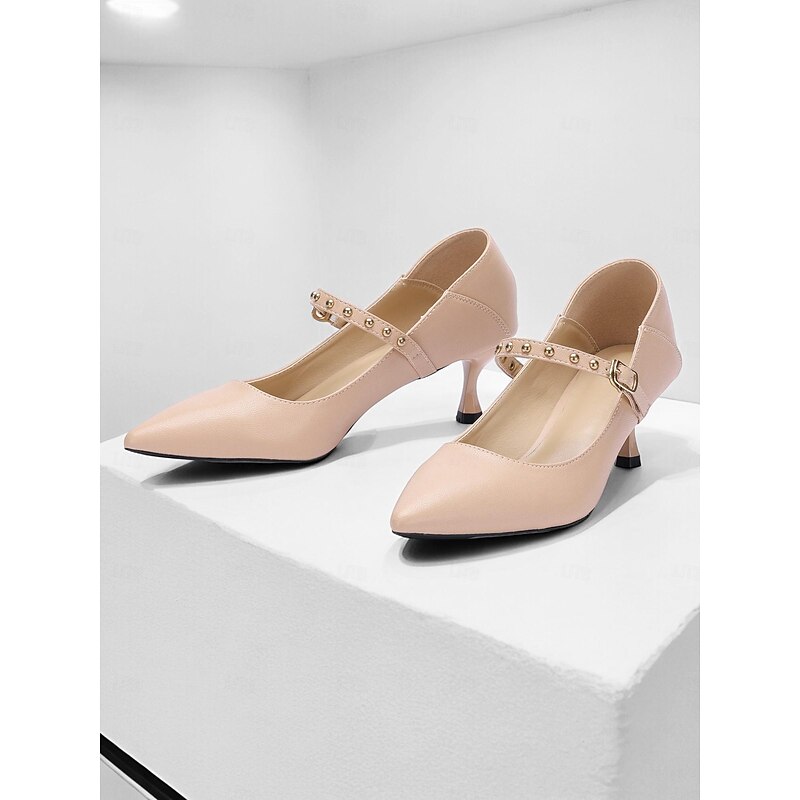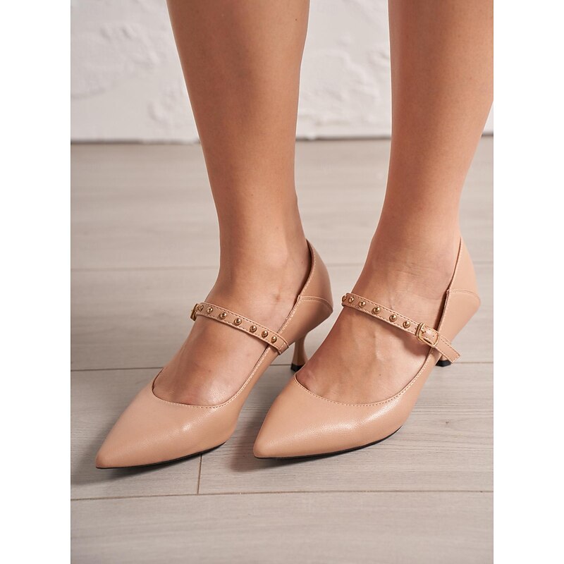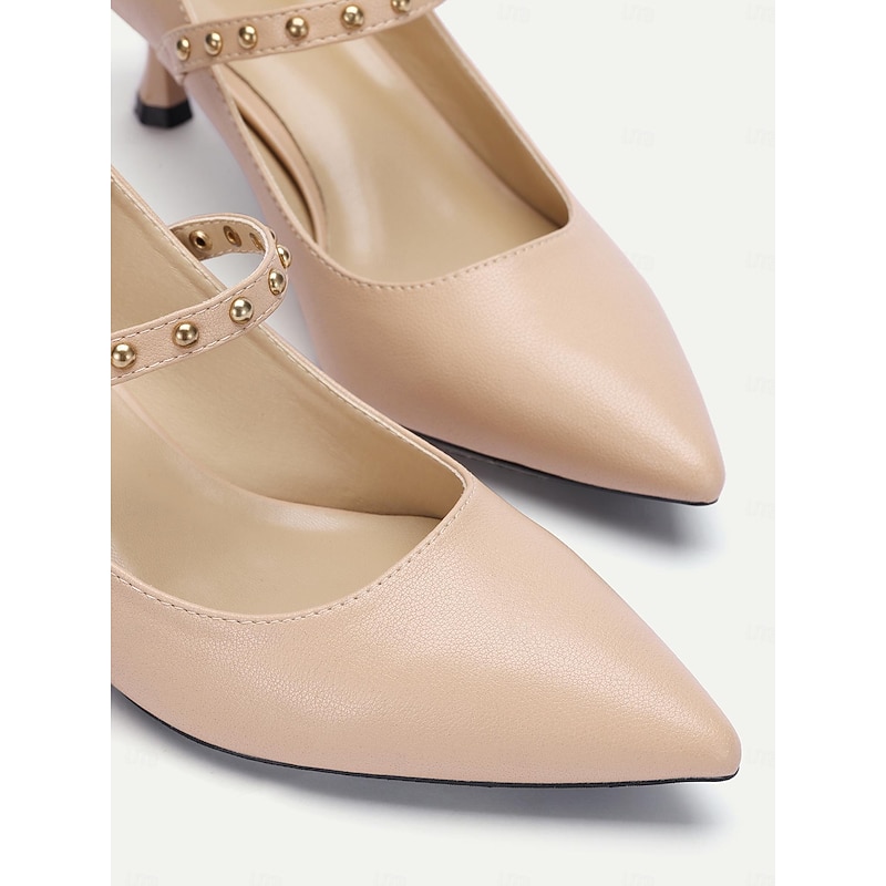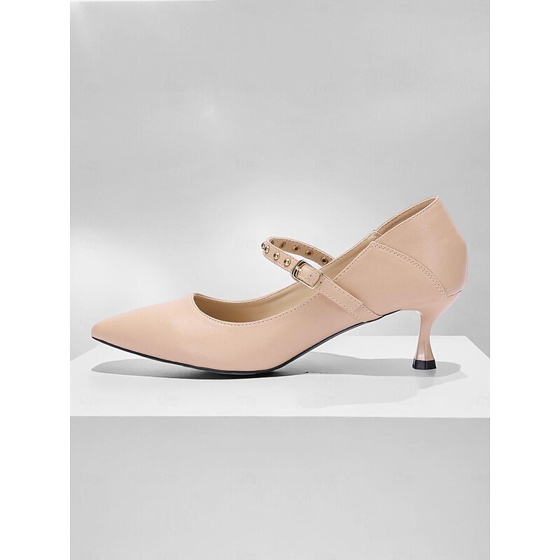 Highlights [Fabric] : Crafted from high-quality faux leather, these women's pumps offer a sleek and sophisticated look. The durable material ensures longevity while maintaining a luxurious exterior. [Silhouette] : Featuring a chic kitten heel design, these shoes provide the perfect balance between style and comfort. The pointed toe adds an elegant touch that elongates the legs, making them ideal for both professional and formal settings. [Design Highlights] : These pumps are adorned with a trendy Mary Jane ankle strap, embellished with tasteful gold-tone studs for a current and edgy appeal. The adjustable buckle closure ensures a secure fit and personalized comfort, perfect for long wear. [Occasions] : Perfect for a variety of settings, from office environments to formal events such as weddings and parties. Their versatile nude color allows them to complement an array of outfits, making them a staple piece for vacation packing or business travel. [Size Range] : Available in a range of sizes from US5.5 to US10.5, these pumps cater to various foot sizes, ensuring a cushy and precise fit for every wearer.