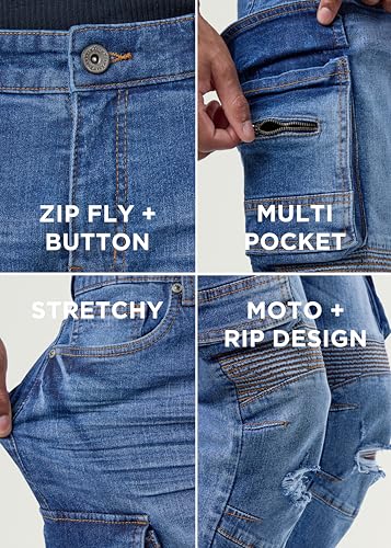 RAW X Men's Stretch Ripped Cargo Pocket Jeans, Slim Fit Motor Biker Comfort Denim Jean Pants for Men 6