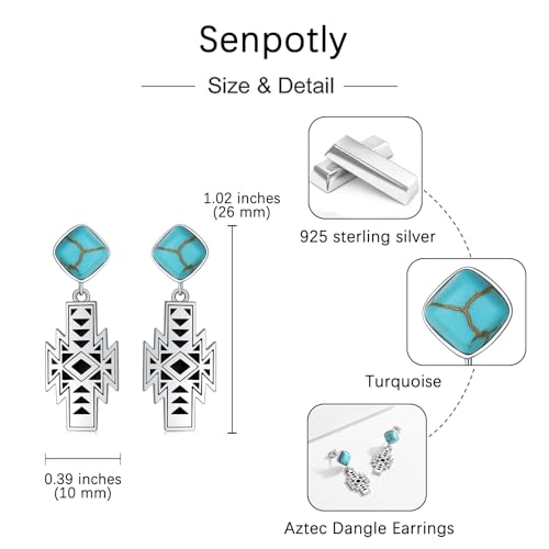 Material: S925Metal type: Sterling SilverBack Finding: Push BackEarring design: DangleGem type: No GemstoneDesign - These earrings studs are inspired by the Aztecs. Wearing these stud earrings will add a touch of beauty to your daily dressing.Turquoise Aztec Stud Earrings - The Aztecs are considered one of the great civilizations of the Americas. Wearing these Aztec stud earrings to remember this great civilization.Ideal Jewelry Gift - Perfect idea gift for wife, mother, girlfriend, daughter, sister, or friend for Valentine's Day, Mother's Day, Anniversary, Birthday, or Christmas. Ideal gift to your loved one.Materia - Made of 100% 925 sterling silver, does not contain any allergic element, is lead-free, nickel-free, cadmium-free, and hypoallergenic.Size - The size of the Aztec ear stud is 1.02 inches * 0.39 inches, The Aztec turquoise stud earrings are packaged in a delicate jewelry box.We are committed to providing distinctive luxurious quality jewelry. If you have any questions about our product or our service, please feel free to contact us, We will assist you to find a solution promptly. Perfect for everyday use. excellent materials and excellent craftsmanship ensure long-lasting durability.