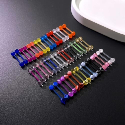 • Acrylic Tongue Ring Set: The order Includes Package comes with 48 pcs flexible straight barbells in 3 Styles, 16 pieces glow in the dark plastic tongue rings, 16 pieces candy color moire tongue rings, 16 pieces multi-color glitter tongue rings. Chic design, stylish and delicate. No matter night or day, you can choose different tongue rings according to your mood to show your personality