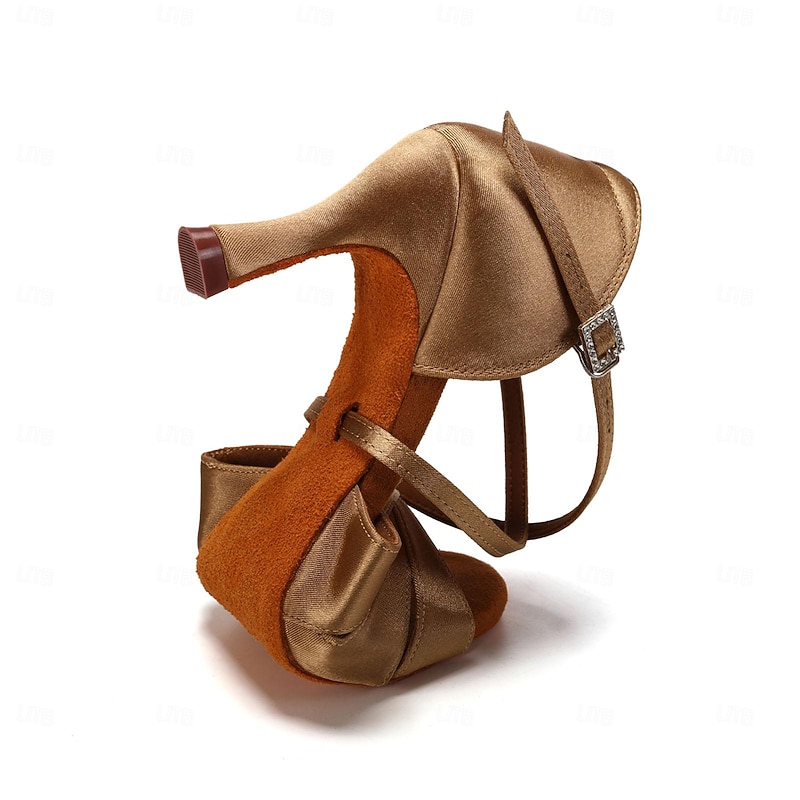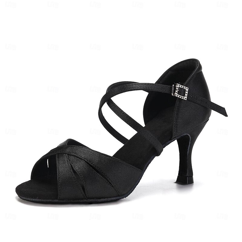 Highlights [Fabric] Crafted from premium satin, these Women's Ballroom Dance Shoes offer a luxurious sheen and durable construction. The high-quality satin fabric ensures comfort during long hours of dancing, enhancing your performance with its soft and smooth texture. [Style] Designed in a classic Latin dance style, these shoes feature an elegant open-toe design that is perfect for various dance styles including ballroom, salsa, and tango. The medium-height flare heel at 5cm provides a perfect balance of stability and elegance, making it suitable for both beginners and seasoned dancers. [Design Highlights] The shoes are adorned with crisscross straps for added support, adjustable through a sparkling rhinestone buckle for a touch of glamour. The open-toe design paired with a suede sole ensures excellent grip and flawless movements on the dance floor. Available in striking colors such as black, silver, brown, red, and light brown, they can complement a wide array of dance outfits. [Occasions] Ideal for both professional dance competitions and social dancing events, these shoes are suitable for indoor practice sessions or elegant dance soirées. Whether you're performing at a dance studio or gliding across the floor at a wedding reception, these shoes blend style and functionality effortlessly. [Size] Available in a range of US sizes from 5 to 10, these dance shoes cater to adult women looking for their regular size, ensuring a perfect fit for enhanced dance performance.