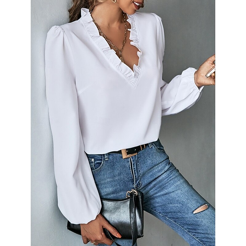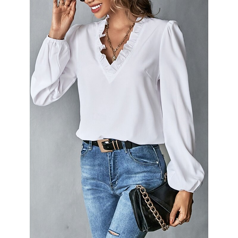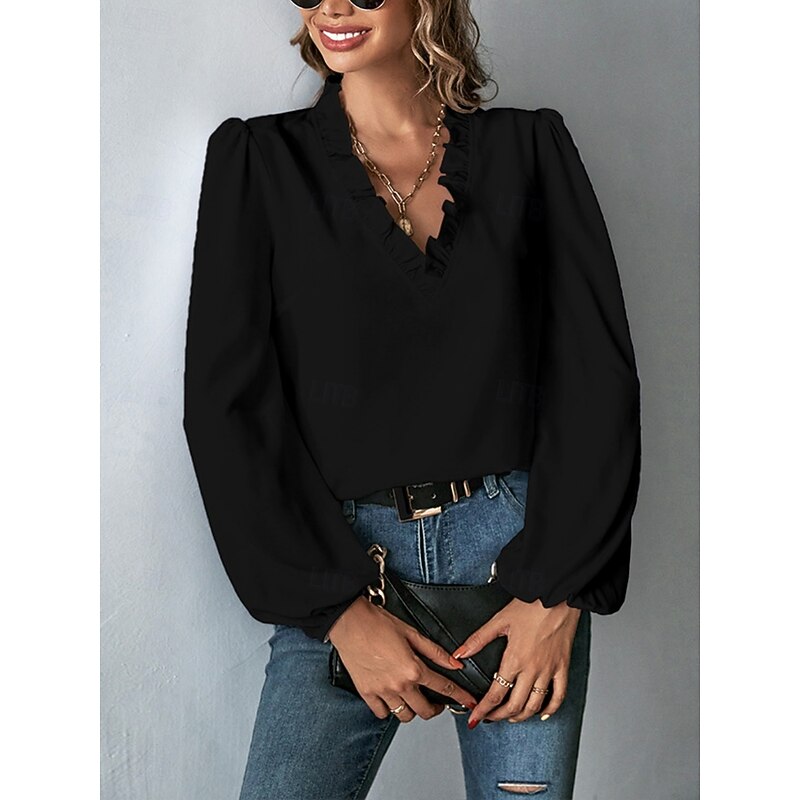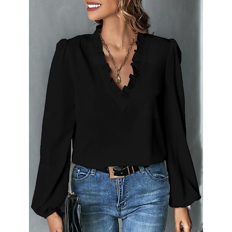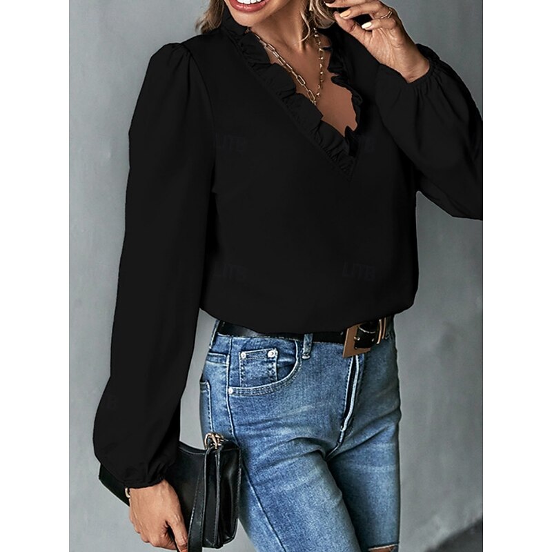 More information about Women's Shirt Solid Color Stylish Casual Long Sleeve V Neck Regular Tops Daily Ruffle Black White Spring Fall Winter