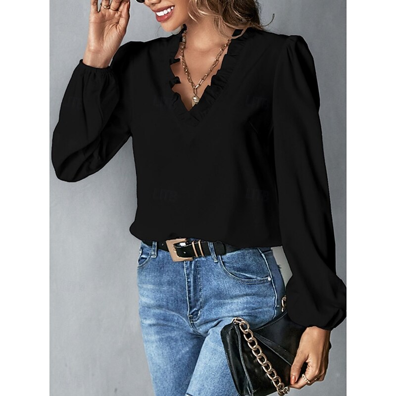 HOT ! Women's Shirt Solid Color Stylish Casual Long Sleeve V Neck Regular Tops Daily Ruffle Black White Spring Fall Winter