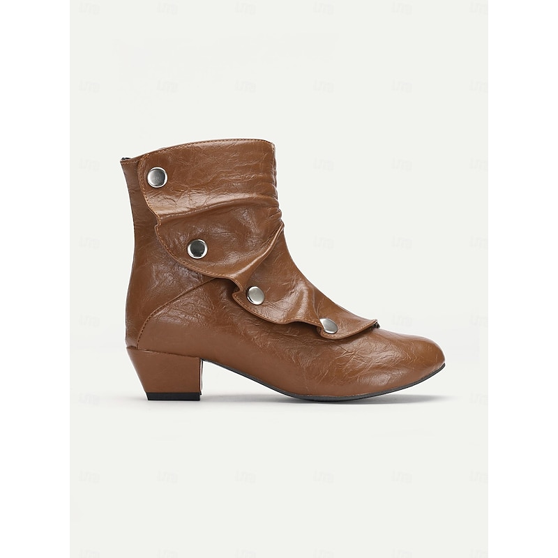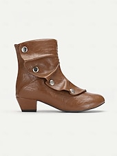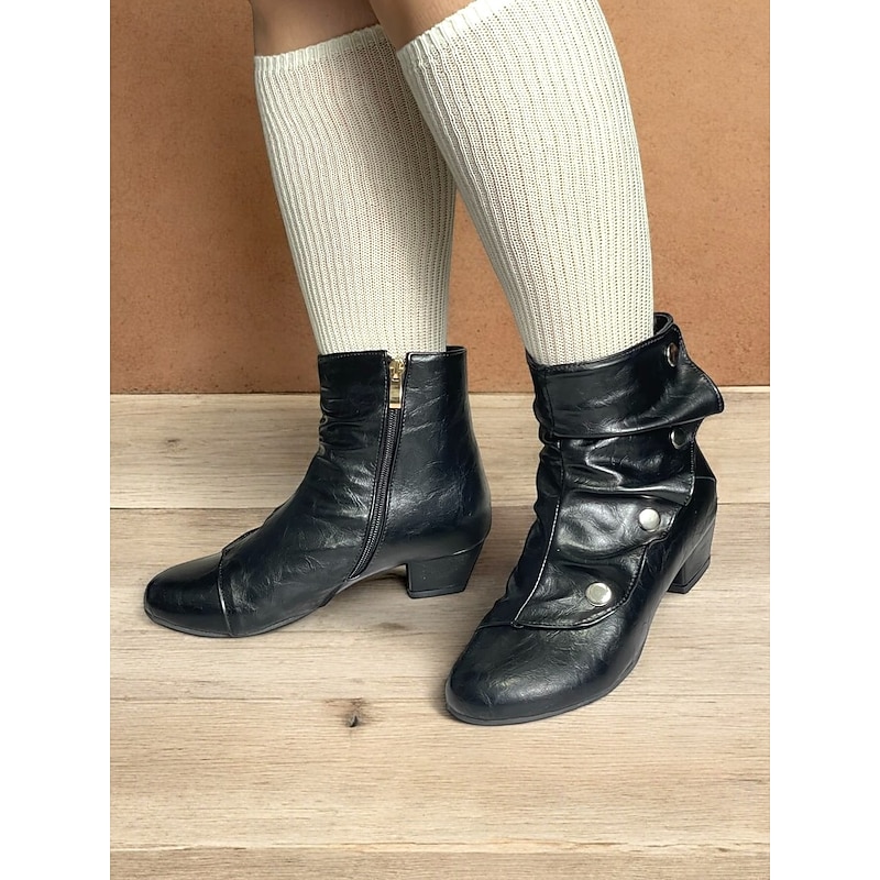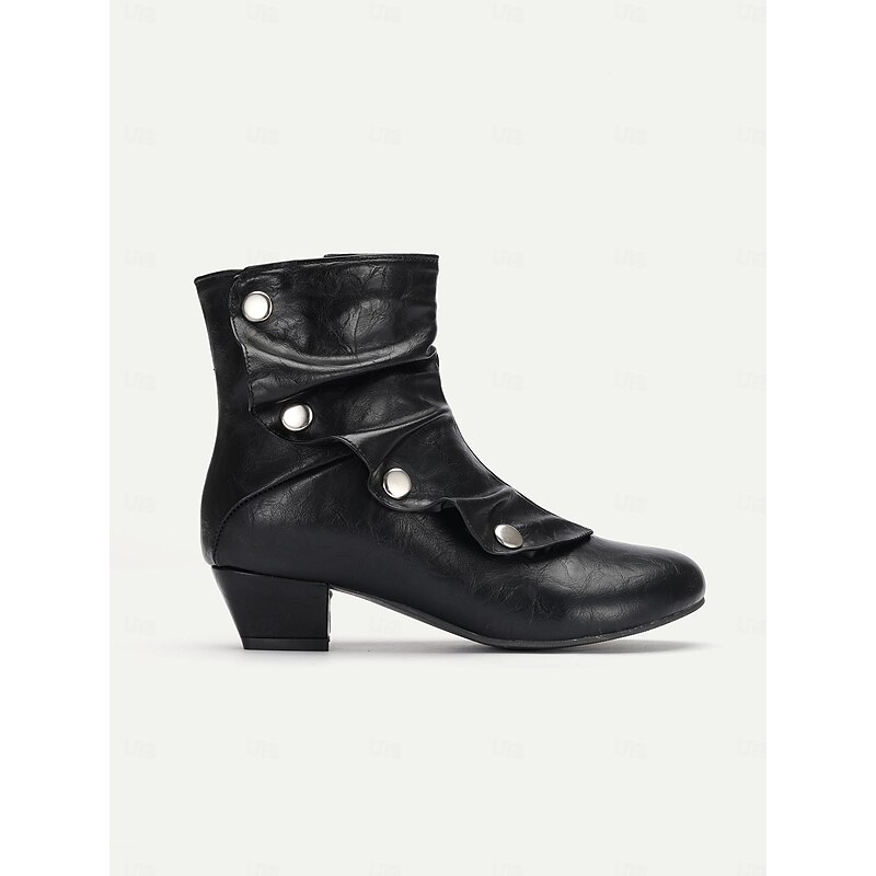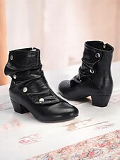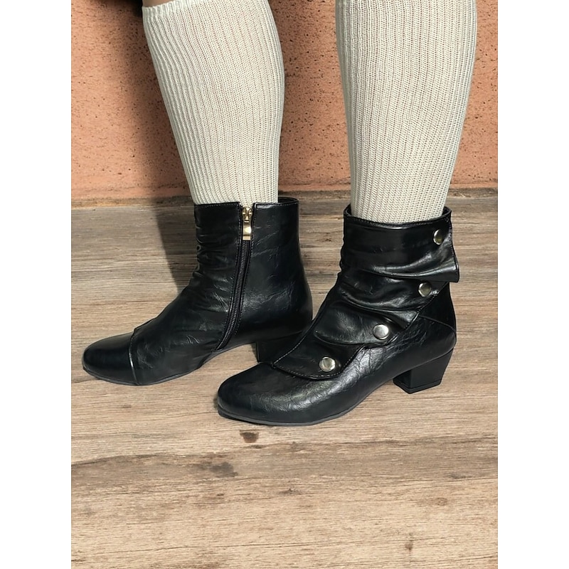 Highlights [Fabric] : Crafted from premium black PU, these vintage-inspired mid heel boots feature a sleek faux leather design, ensuring durability and a polished appearance. The interior combines synthetic leather and textile materials for a comfortable fit. [Silhouette] : The boots boast a distinctive slouchy silhouette, balanced by a chunky heel that offers stability without sacrificing style. The rounded toe creates a roomy fit, enhancing all-day comfort. [Design Highlights] : These ankle boots are adorned with decorative silver-tone buttons and a convenient side zipper, combining functionality with elegant flair. The adjustable strap ensures a personalized fit, while the short block heel adds a touch of sophistication. [Occasions] : Versatile for multiple settings, these boots transition seamlessly from office to evening wear. Ideal for parties, daily outings, or work environments, they pair beautifully with both jeans and dresses, adding a chic, contemporary look to any ensemble. [Size Range] : Available in US sizes 5 to 13, these boots cater to a wide range of foot sizes, providing an inclusive fit for women seeking a blend of vintage style and modern comfort.