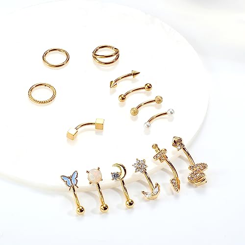 • Eyebrow Piercing Jewelry Set:You Will Get 11 pcs 16G Curved Eyebrow Rings And 3 pcs Cartilage Hoop Piercing in Different Styles, Which Are Designed with Butterfly, Snake, Moon, Flowers, special And vintage, More Choices for Everyday Wear