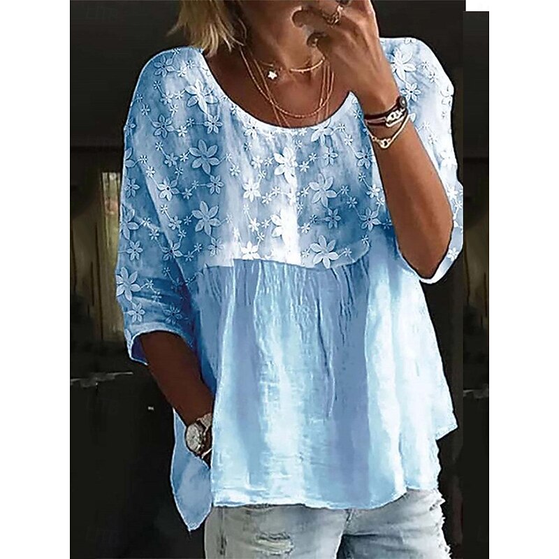 Highlights [Fabric]: Crafted from lightweight and breathable cotton, this women's blouse ensures comfort and ease for daily wear. The fabric offers a micro-elastic stretch, maintaining its shape and providing a relaxed fit. [Fit]: Designed with a regular fit, the blouse offers a comfortable and loose silhouette, perfect for casual and everyday styling. The three-quarter length sleeves provide added versatility for warmer spring and summer days. [Design Highlights]: Featuring a V-neckline, this blouse stands out with its exquisite floral lace embroidery across the upper portion and sleeves, adding a romantic and feminine touch. The delicate patchwork design enhances its chic and stylish appeal, making it a versatile piece in your wardrobe. [Occasions]: Ideal for daily and casual occasions, this blouse can be effortlessly paired with jeans or skirts for an easy, laid-back look. It's perfect for running errands, meeting friends, or any casual outing where style and comfort are priorities. [Size Range]: Available in a range of sizes from S to 2XL, accommodating a variety of body types and preferences for the perfect fit.