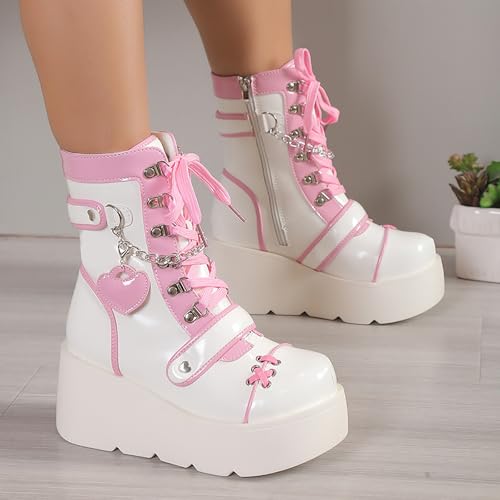Women's Leather Platform Goth Rave Ankle Boots With Side Zipper Comfort Round Toe Lug Sole Wedge High Heel Kawaii Booties Cute Chain Lace Up Punk Y2K Combat Boots 5