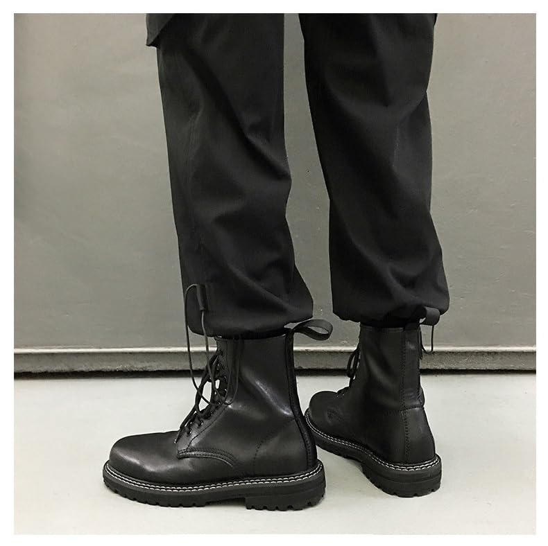 • These men's motorcycle boots look stylish and functional. Men's combat boots are made from premium layered cowhide leather. The front tie makes it easy to put on and take off, blending style and convenience.
