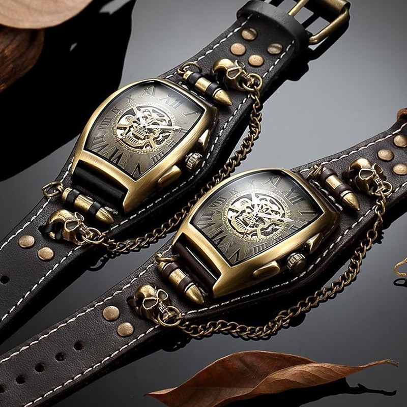 Cool Men Style Automatic Mechanical Analogue Watch Steam Punk Rock Gothic Leather Strap Black Brwon Watch Bullet Hollow-carved Design 10