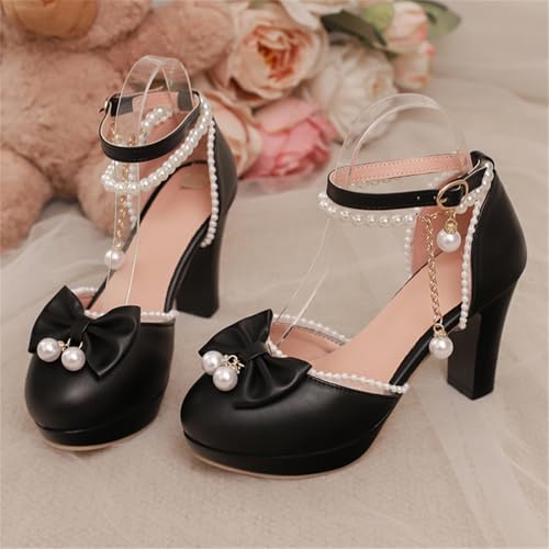 Inornever Mary Jane Shoes Women Platform High Heels Round Toe Single Strap Buckle with Bow Pearl Accents PU Dress Pumps for Women Pink White Black 5